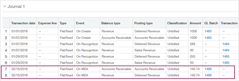 Am 15. Februar haben Sie die Widgets mit einer Widget-Supportvertragsposition gebündelt und den Umsatz zwischen den Vertragspositionen neu zugeordnet. Dies führte zu einem Gesamtumsatz von 1.140,74 für die Widgets. In diesem Szenario wurde die Vertragsposition noch nicht fakturiert, sodass Intacct eine Korrektur von 140,74 für die Konten "Nicht fakturierte Forderungen" und "Nicht fakturierte Rechnungsabgrenzungsposten" erfasst hat. Dies wird im Abschnitt Tab "Transaktionshistorie" In der Vertragsposition: