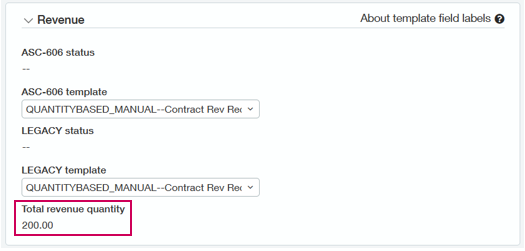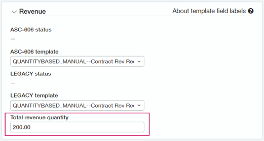 - Geben Sie die gesamte vertraglich vereinbarte Menge in die Leiste Gesamtumsatz-Menge -Feld. Intacct verwendet diesen Betrag, um den Prozentsatz des festen Betrags für die Erfassung der einzelnen anwendbaren Anerkennungszeiträume zu bestimmen.