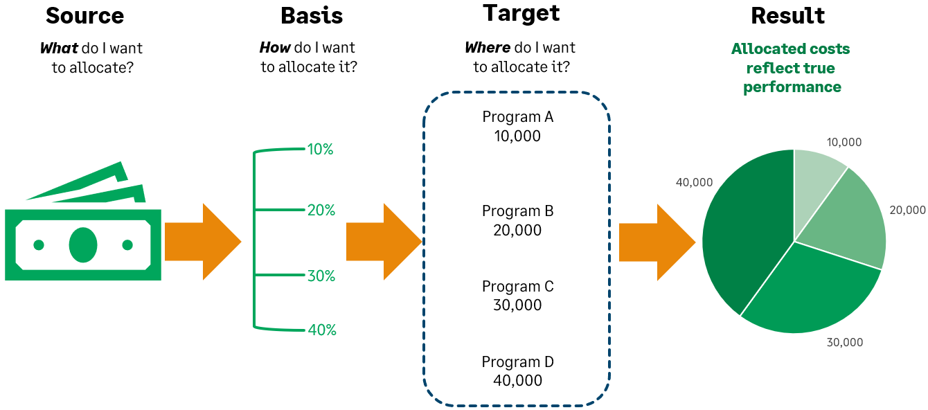 Angenommen, Sie haben eine Dimension namens "Programm" und innerhalb dieser Dimension befinden sich vier Programme: A, B, C und D. Wenn Sie eine Basis (Berechnungsmethode) verwenden, bei der 10 % auf Programm A, 20 % auf Programm B, 30 % auf Programm C und 40 % auf Programm D entfallen, ergibt sich ein Quellsaldo von 100.000, der wie folgt zugewiesen wird: