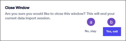 Ja, beenden: Schließt den Importdienst. Der Importdienst behält Änderungen bei, die Sie an dem Importblatt vorgenommen haben, an dem Sie gearbeitet haben. Diese Option verhält sich genauso wie "Beenden und Datensätze speichern" oben.