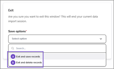 Beenden und Datensätze entfernen: Wenn diese Option ausgewählt ist, entfernt der Importdienst alle Daten aus dem Blatt, das Sie verlassen. Wenn Sie diese Daten nicht in das Blatt importiert haben, gehen die Daten verloren. Wenn Sie zu einem Import zurückkehren, wie z. B. "Zeilen hinzufügen" für statistische Konten, wird ein leeres Blatt mit den Standardoptionen zum Hinzufügen einer Datei geöffnet.