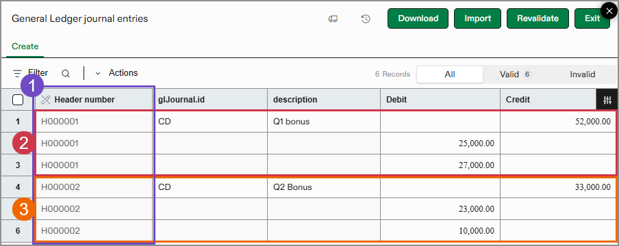 Die Kopfzeilen-Nummer -Spalte weist Zeilen in Ihrem Import automatisch eine nicht bearbeitbare Nummer zu. Diese Spalte soll helfen, Informationssätze, wie z. B. Positionen in einem Journaleintrag, zu identifizieren und zusammenzuhalten. Kopfzeilennummern werden nicht in Intacct importiert, sondern dienen dazu, Gruppen von Informationen zusammenzuhalten, Positionsfehler anzuzeigen und Probleme zu beheben.