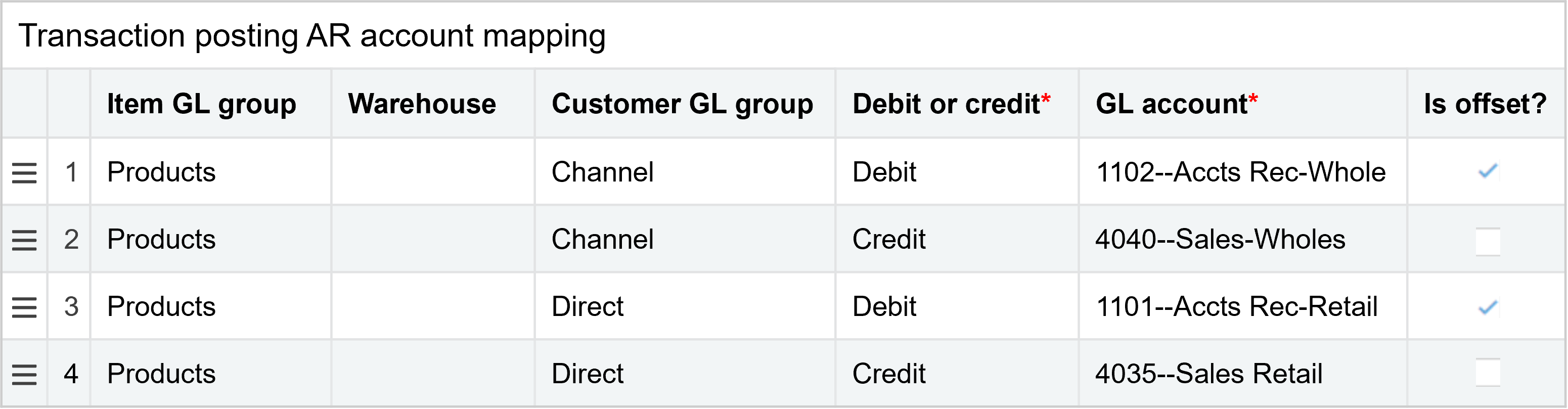 Die Artikel-GL-Gruppe, Warenlagerund Kunde Hauptbuchgruppe bilden zusammen die Kriterien für die Kontozuordnung. Beispielsweise können Sie die Hauptbuchgruppe "Produkte Artikel", "Warenlager 13" sowie "Kanal Kunde Hauptbuchgruppe" einem Hauptbuchkonto und einer Verrechnungs Konto zuordnen und die Hauptbuchgruppe "Produkte Artikel Hauptbuch", "Warenlager 13" und "Direkt Kunde Hauptbuchgruppe" einem anderen Hauptbuchkonto und einer anderen Verrechnungs Konto zuordnen.