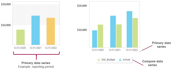 Die angezeigten Daten sind eine Kombination aus dem Datenserie Wird verwendet, um Werte (z. B. Ihre Spalten oder Tortendiagrammsegmente) und die unter "Zusätzliche Parameter" angegebenen Buchhaltungsdaten zu kategorisieren. Alle Diagramme haben mindestens einen Primäre Datenserie. Für einige Diagrammtypen können Sie optional einen Datenserien vergleichen. Alle Daten, die nicht als Datenserie ausgewählt sind, werden wie folgt angegeben Zusätzliche Parameter.