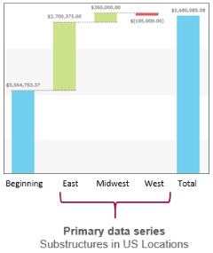 Resultierendes Wasserfalldiagramm Wenn Sie die primäre Datenserie auf "Dimension" setzen und US-Standorte auswählen, werden die Unterstrukturen (Ost, Mittlerer Westen und West) zu Zwischenspalten im Wasserfalldiagramm.
