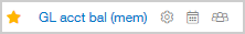 Reports können mehrere Symbole haben. Im folgenden Beispiel verfügt der Hauptbuch-Report über Symbole, die angeben, dass es sich um ein Lesezeichen, "Gemerkt", "Geplant" und "Öffentlich" handelt.
