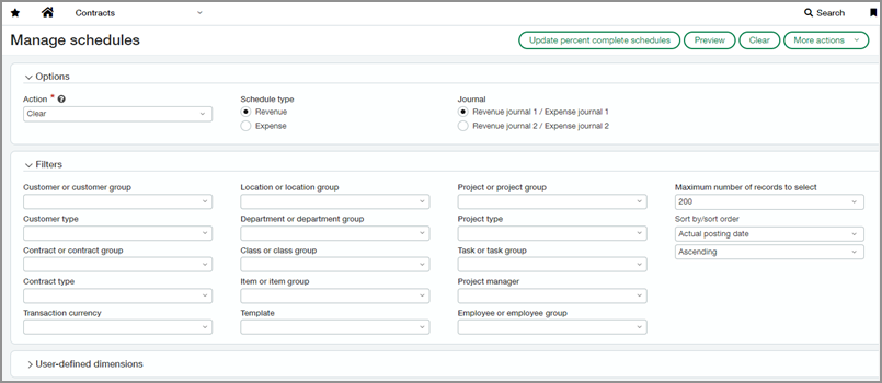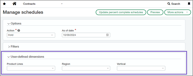 Wir haben der Seite "Zeitpläne verwalten" Supportoptionen für benutzerdefinierte Dimensionen hinzugefügt, mit denen Sie die Liste der Zeitpläne oder Vertragspositionen, die Sie ändern möchten, verfeinern können. Der neue Abschnitt "Benutzerdefinierte Dimensionen" befindet sich im Abschnitt "Filter".