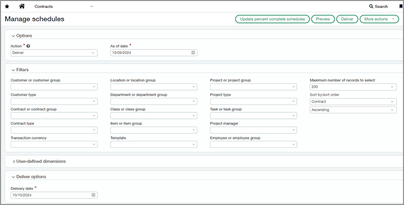 Jetzt können Sie mehrere Verträge manuell verrechnen oder im Bulk-Verfahren liefern, sodass Sie nicht mehr auf jeden Vertrag einzeln zugreifen müssen. Wenn Sie diese Aktionen initiieren, erstellt Sage Intacct einen Datensatz für die Ausführung von Bulk-Aktionen und führt den Prozess offline aus.