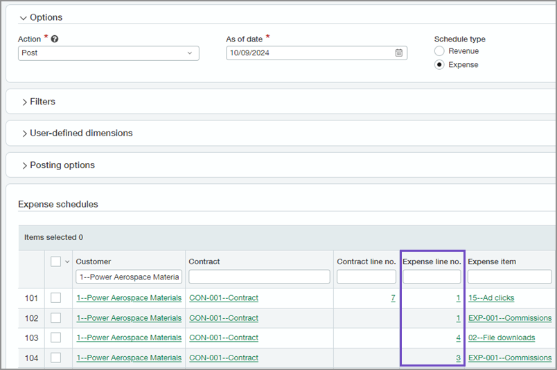 Wir haben die Spalte Ausgabenpositionsnr. zur Ergebnistabelle für die Aktion "Buchen" hinzugefügt, damit Sie leichter zwischen Zeilen unterscheiden können. Diese Ergänzung passt sich auch an die Struktur der Liste der Ausgabenpositionen an.
