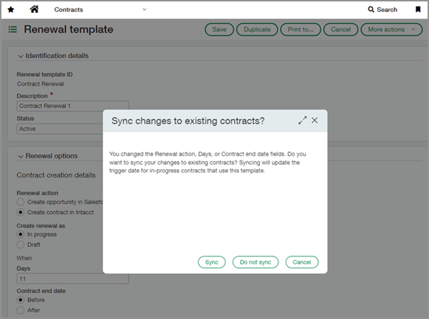 Durch die Synchronisierung wird das Auslösedatum für laufende Verträge, die diese Vorlage verwenden, aktualisiert. Synchronisierungen erfolgen unidirektional, und zwar von der Vorlage bis zum Vertrag.