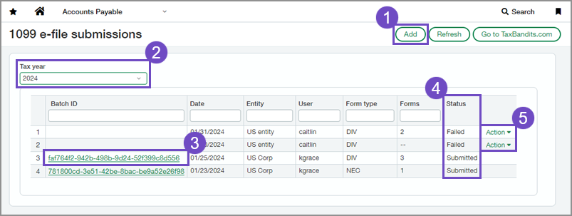 Erstellen Sie einen Batch für einen Lieferantenbereich oder einen Batch eines Formulartyps, z. B. 1099-MISC. Senden Sie den Batch dann mit einem Klick auf eine Schaltfläche an TaxBandits, wo der Prozess der elektronischen Einreichung fortgesetzt wird. Sie können mehrere Batches erstellen und an TaxBandits senden.