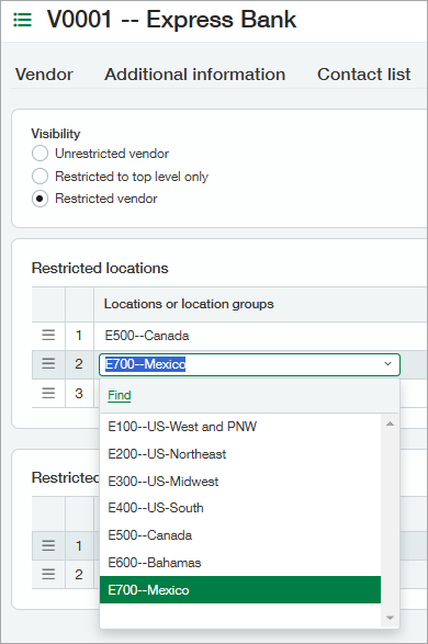 Die Auswahl von Standorten oder Abteilungen für Lieferanteneinschränkungen funktioniert jetzt ähnlich wie das Hinzufügen von Einträgen zur Lieferantenkontaktliste. Fügen Sie eine neue Einschränkung in einer leeren Zeile hinzu, indem Sie einen Standort oder eine Abteilung aus der Dropdown-Liste auswählen. Wenn Ihnen die leeren Zeilen ausgehen, wählen Sie Hinzufügen aus. Um eine Zeile zu entfernen, wählen Sie Entfernen aus.