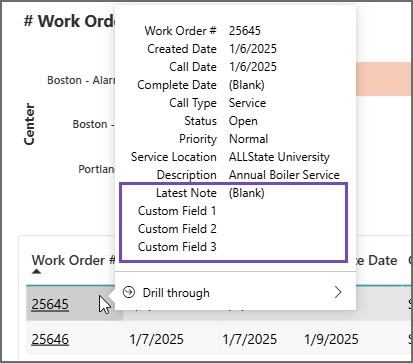 Bewegen Sie in der Tabelle "Arbeitsaufträge" den Mauszeiger über einen Arbeitsauftrag, um wichtige Erkenntnisse für den Arbeitsauftrag anzuzeigen, einschließlich der neuesten Notiz und der drei relevantesten benutzerdefinierten Felder.