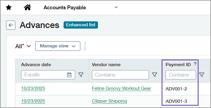 - Verbesserte Rückverfolgbarkeit: Intacct zeigt die Zahlungs-ID in Standardansichten der Liste der "Vorschüsse" und auf der Detailseite für gebuchte Vorschüsse an. Auf diese Weise können Sie die Vorschussliste anhand der Zahlungs-ID filtern und die Zahlung während der Bankabstimmung schneller abgleichen.