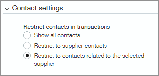 Restrict to contacts associated with selected supplier: Restricts the list of available contacts to only those associated with the selected supplier. The contact must be associated with the supplier you select before creating a transaction.