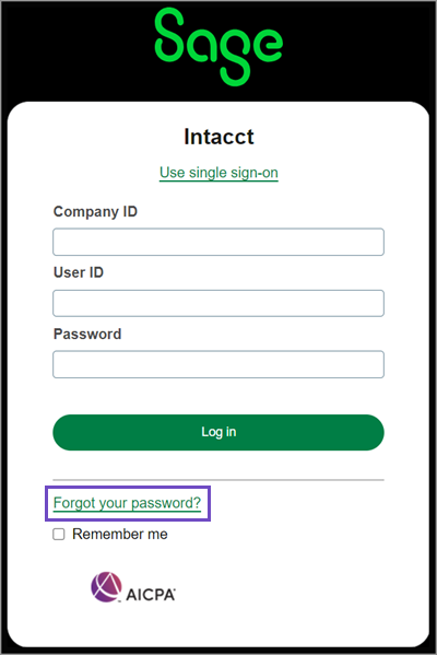 Initiate recovery directly: No need to reach out to support. Simply navigate to the Sage Intacct login page and select Forgot you password?. Intacct then walks you through how to reset your password.