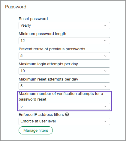 In Login settings, in the Password section, set the Maximum number of verification attempts for a password reset.