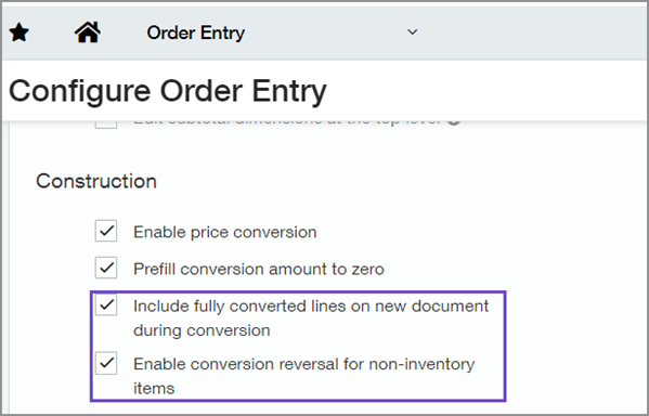 In the Construction section, select Enable conversion reversal for non-inventory items.
