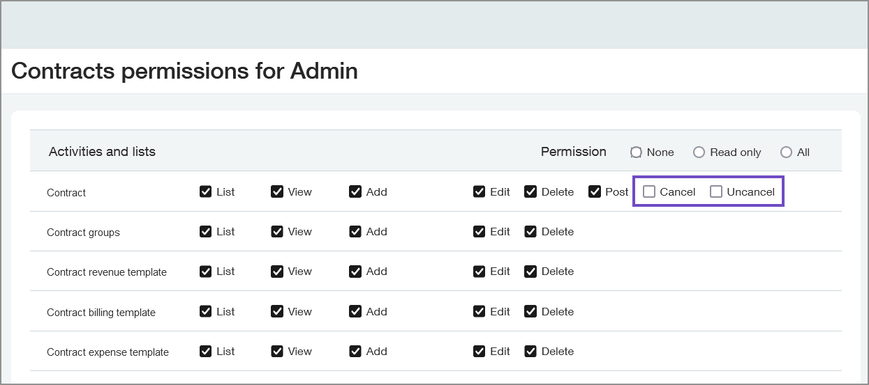The Cancel and Uncancel permissions are only effective when combined with the Contract: Edit permission. |