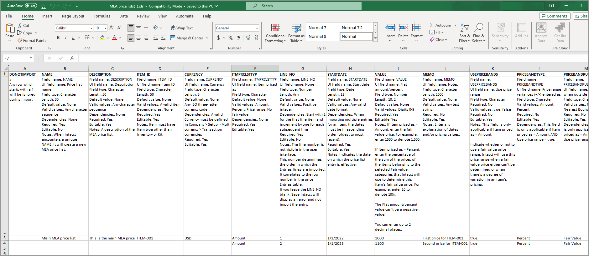We've also included tabs with examples of how to import different types of MEA price list entries. As each price type requires a different set of fields, Sage Intacct recommends that you import like price types in separate processes to avoid errors.