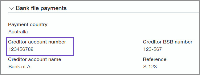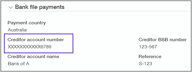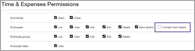 Assign the new Unmask bank details permission, which you can find under the Employee permission set, to grant users access to view an employee's bank file details. This unmasks an employee's creditor account number in the employee record, custom reports, and audit trail.