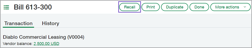 - Select the Recall link at the end of the row.You can also select Recall when you view the AP purchase invoice detail.