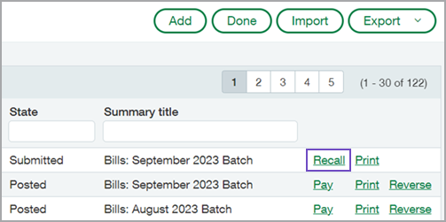 Recall is available on the AP purchase invoices list and in AP purchase invoice detail view for AP purchase invoices that are in a Submitted state. Any user with AP purchase invoices: Edit permissions can recall an eligible AP purchase invoice.