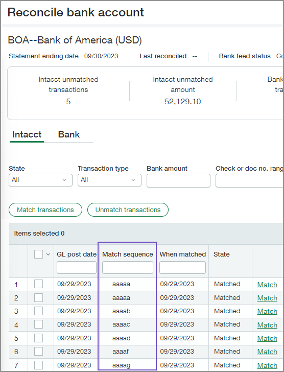 Say you automatically match a Sage Intacct transaction for $100 to a bank transaction credit of $100. Each of these transactions receive a match sequence of, say, aaab. Any subsequently auto-matched transactions receive a sequence lettering of aaac, followed by aaad, and so forth.