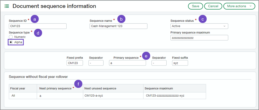 When you select Alpha, you can configure document sequences using lowercase letters. The alpha sequence can then be used by Cash Management for bank and credit card reconciliation, and by users in France for supplier and customer reconciliations. These applications use a combination of lower case and upper case letters to indicate states in the reconciliation process.