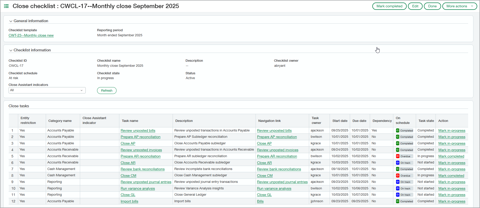 Close checklists help employees track their close-related assignments while giving managers a detailed view of everyone's progress. Templates for close checklists make it easy to create standardized checklists for each period.