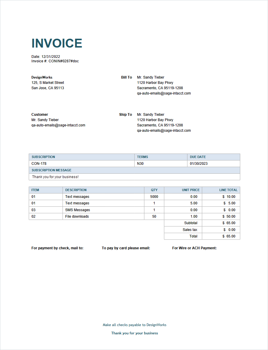 Standard sales invoice sample that includes the subtotal, tax subtotal, total due, and a tax rates table. This sample contains merge fields that only apply to companies subscribed to Taxes.