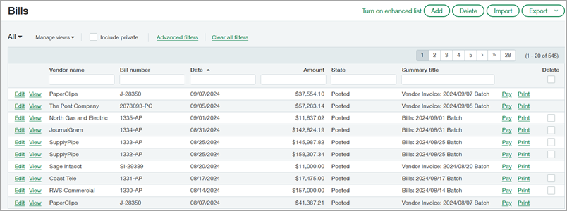 Each line is a bill record, or an individual transaction. From the list, you can perform actions on these individual records with the Edit, View, Pay, and Print buttons. You could export a list of all these records. You could use the columns to sort or type in the column boxes to filter. To sum it up, when you're on a list, ask yourself "What specific thing am I looking for?". Lists are a key part of Intacct, so be sure to get familiar with them and how best to use them.