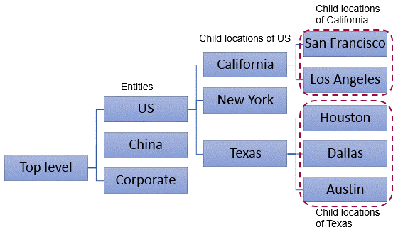- The US entity has child locations for California, New York, and Texas.