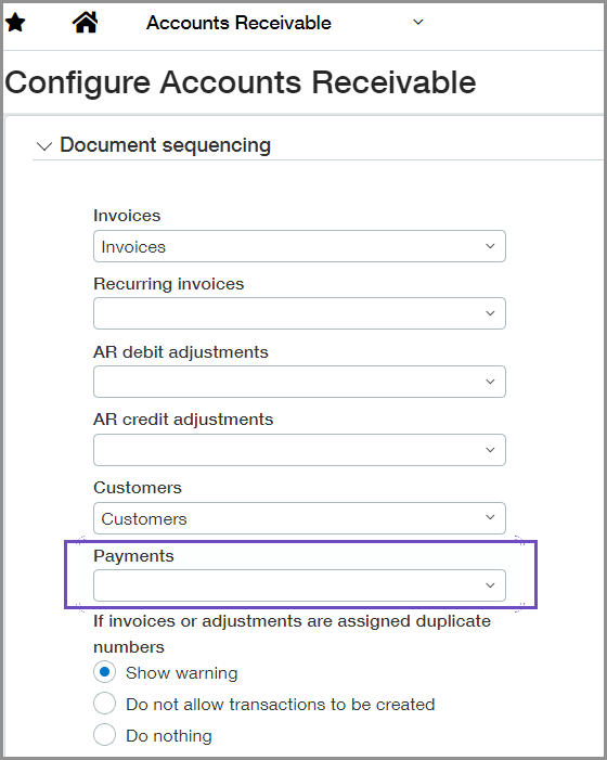 With document numbering sequences, Intacct automatically generates new IDs for common transactions and records. First, you set up a document sequence for AR payments. Then, Intacct automatically generates a Payment ID for all new posted payments.