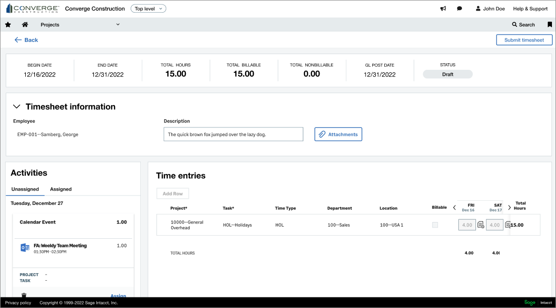 We're excited to announce an Early Adopter program for the timesheet experience. You can now access Sage Intelligent Time (SIT) directly from the Time and Expenses or Projects applications in Sage Intacct, eliminating the need to manage timesheets in a separate platform.