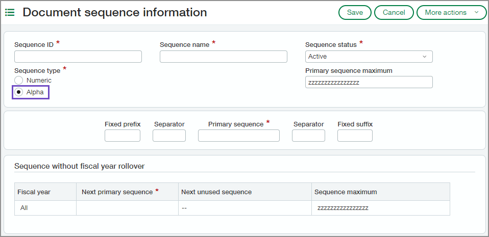 When you select Alpha, you can configure document sequences using lowercase letters. The alpha sequence can then be used by Cash Management for bank and credit card reconciliation, and by users in France for vendor and customer reconciliations. These applications use a combination of lower case and upper case letters to indicate states in the reconciliation process.