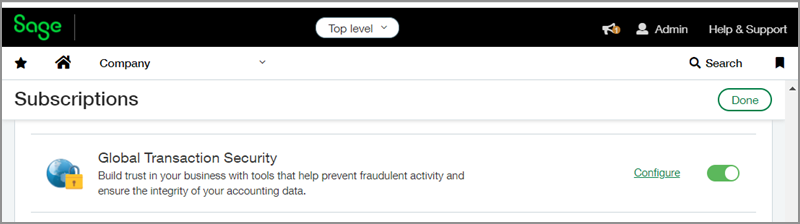 Administrators can subscribe to and configure Global Transaction Security on the Subscription page for their company.