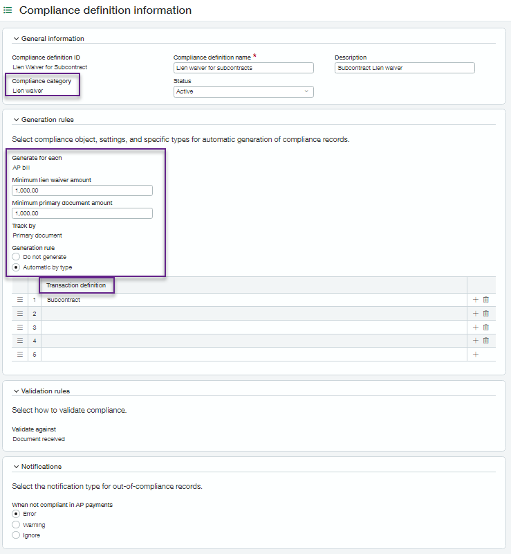 First, create compliance definitions and types that generate lien waiver records automatically for primary document-enabled Purchasing transaction definitions. The newly created lien waiver records are incorporated automatically into our compliance tracking and notification system. Using the system-generated compliance records, you can then print or email lien waiver documents using your customized templates.