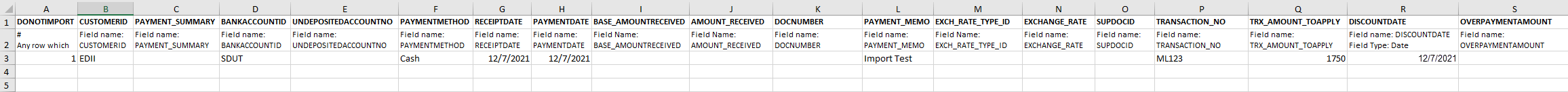 When importing AP supplier invoices or AR sales invoices, if errors are found during upload, the entire CSV file is rejected. You can more easily find the errors in the file if you use row numbers in the Do Not Import column (1). If your CSV file is rejected because errors are found, the error file contains the original row number, allowing you to quickly pinpoint where to make changes (2).
