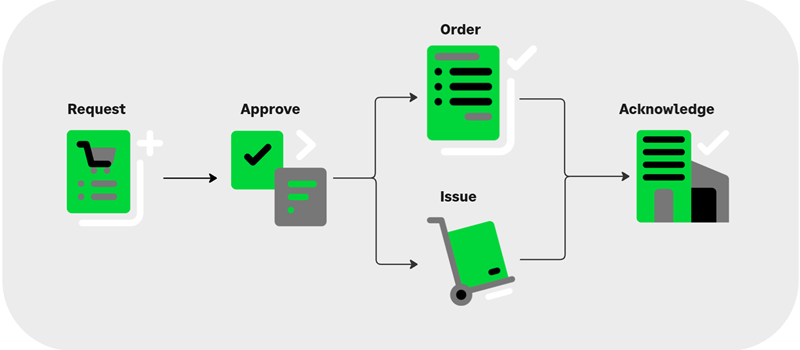 Process the request as an Issue or Order: With stock on hand, you can immediately issue items. If quantity is needed to fill a request, look up a substitute, create a supplies purchase order, or link the request to an existing purchase order. You'll issue ordered items when they arrive.