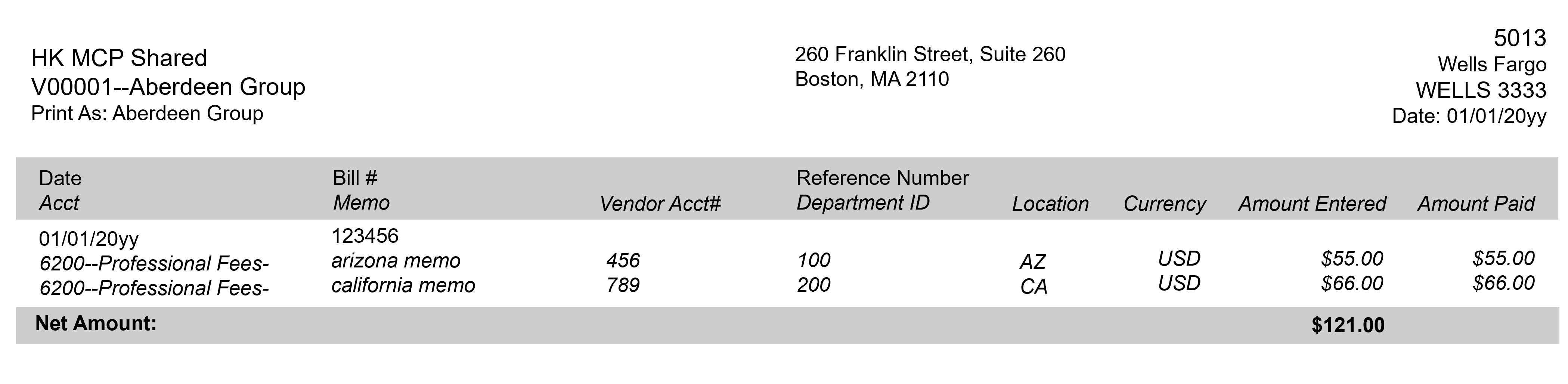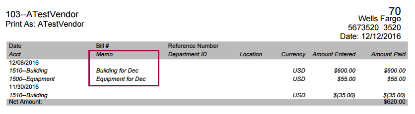 Seleccionar Detalles del talón del proveedor incluye la misma información (detalles de la partida, notas, identificadores de departamento y ubicaciones) que la que aparece en el talón de cheques.