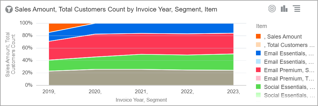 El gráfico de área del 100 % muestra los datos trazados como áreas apiladas, por lo que el área acumulada siempre representa el 100 %. Este gráfico muestra el porcentaje que cada componente contribuye a la progresión a lo largo del tiempo. |