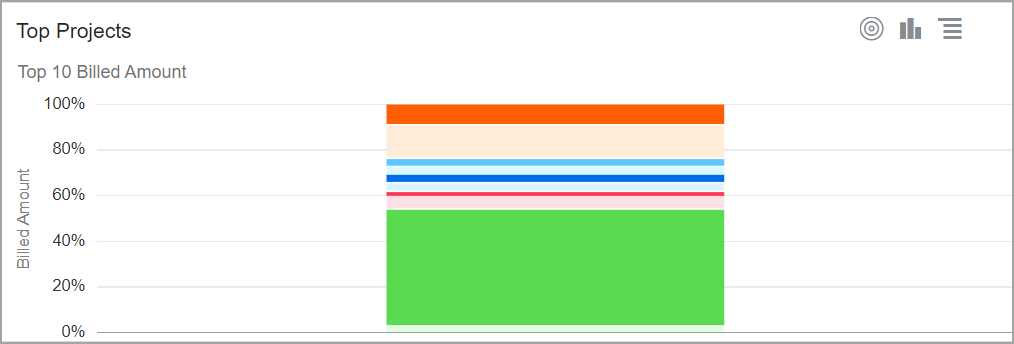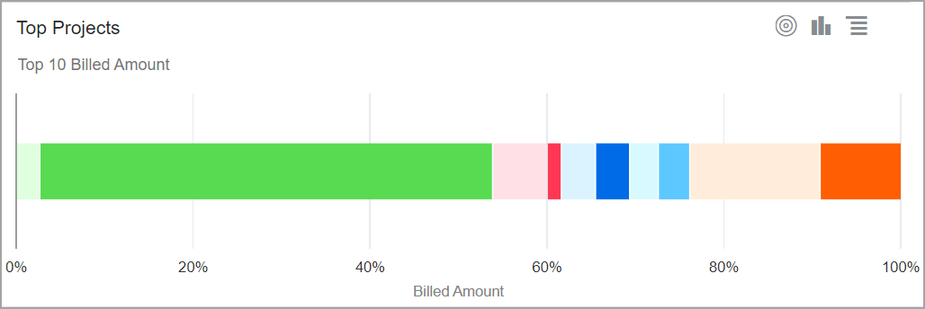 El gráfico horizontal del 100 % contiene barras horizontales, cada una de las cuales representa el 100 % del valor de los datos. Todas las barras tienen la misma altura. Los anchos representan las variaciones numéricas que se muestran como porcentajes. |