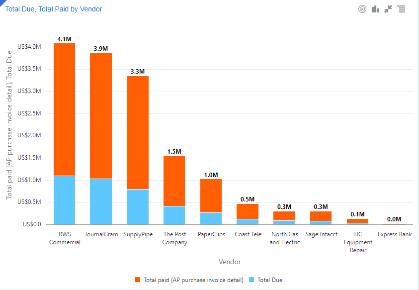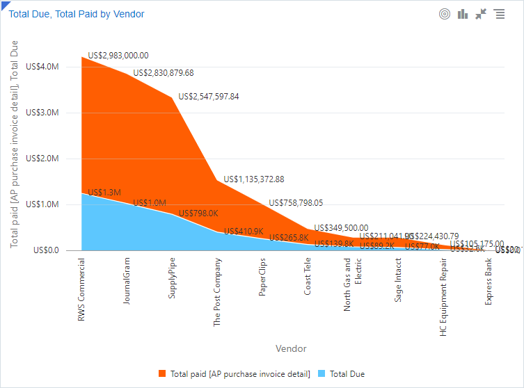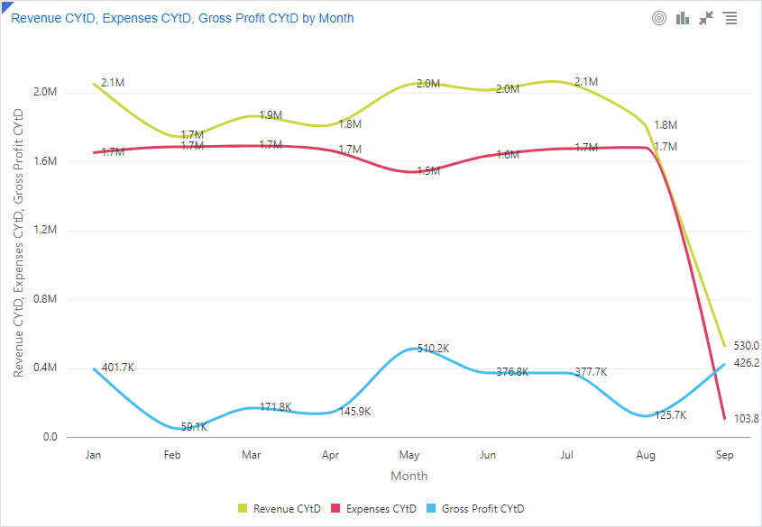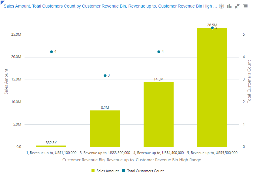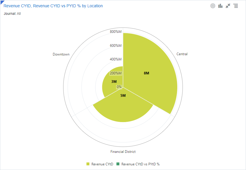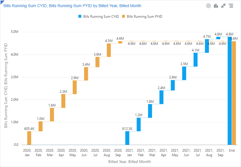 Los gráficos combinados se superponen a dos gráficos diferentes con un eje horizontal compartido. Estos gráficos son útiles para mostrar una comparación entre los dos valores verticales. Puede analizar el contexto de la variable de eje horizontal junto con la comparación de valores verticales. |