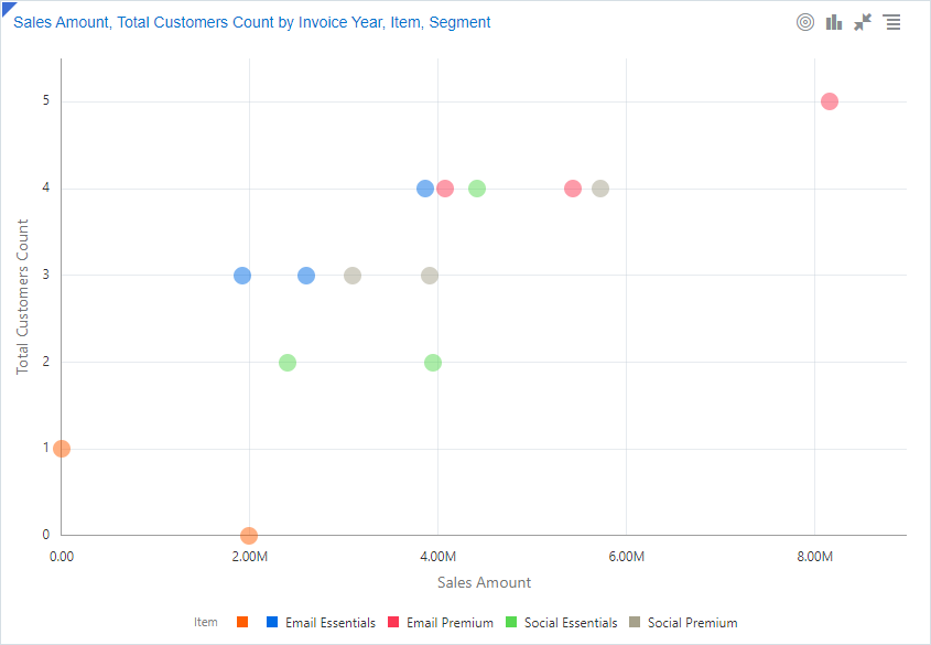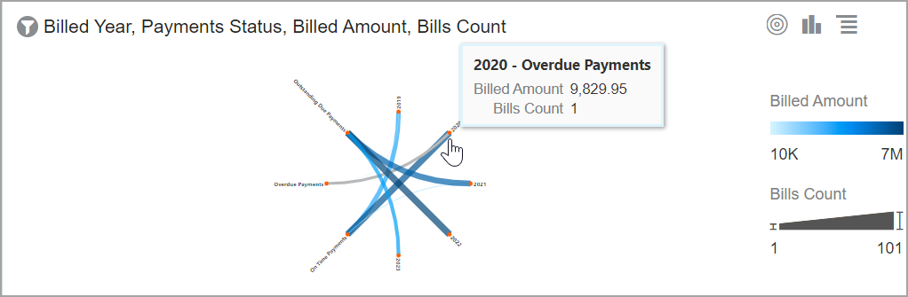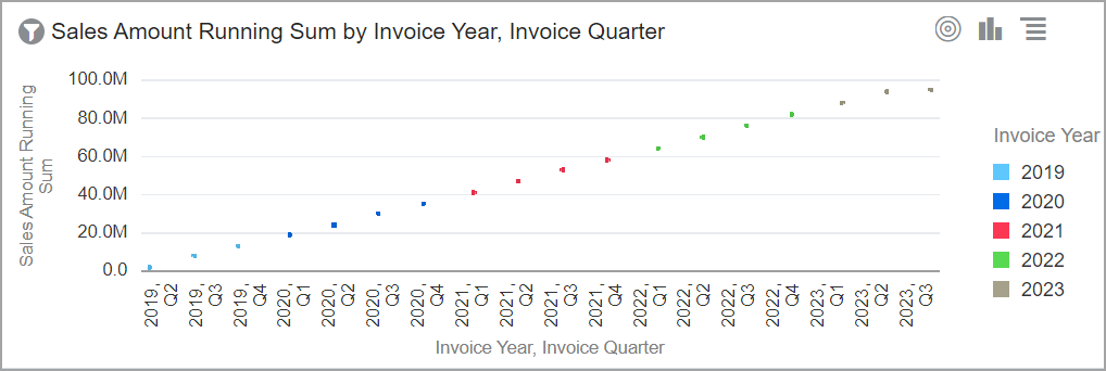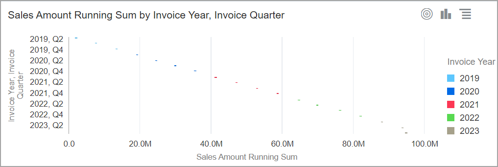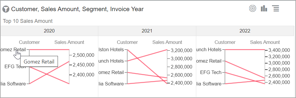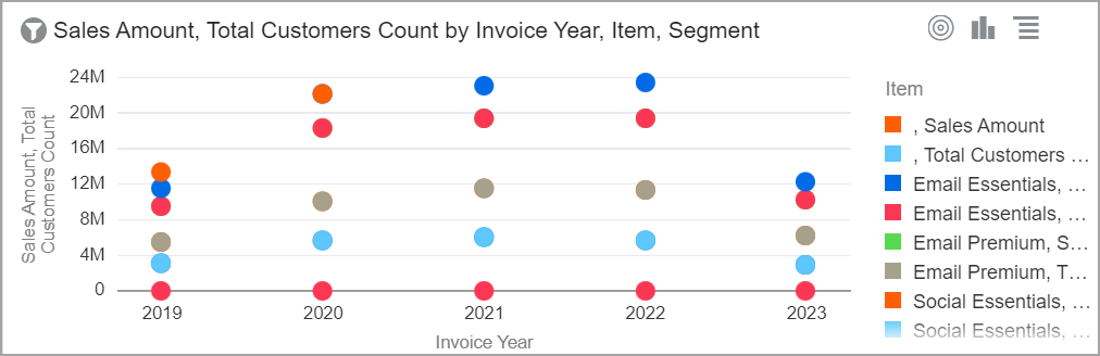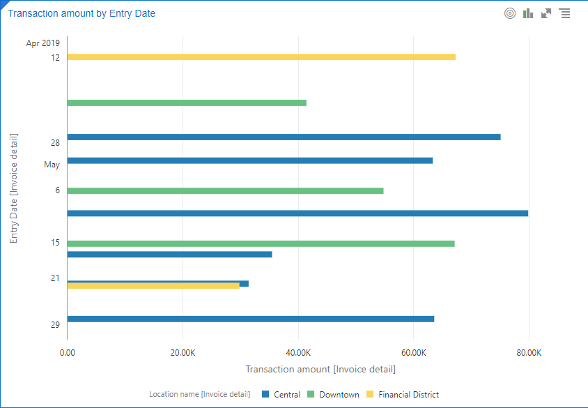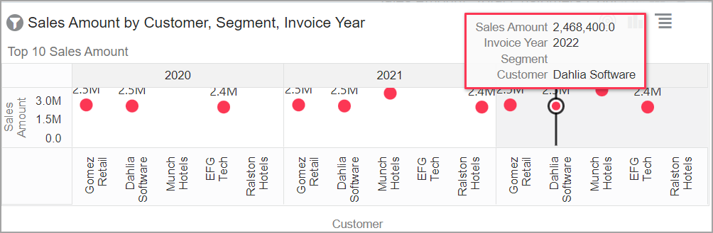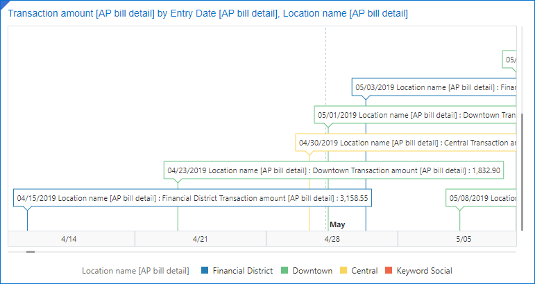 El gráfico dinámico agrega datos de resumen en forma de tabla dinámica desplazable. La visualización le permite ver comparaciones, patrones y tendencias en sus datos. |