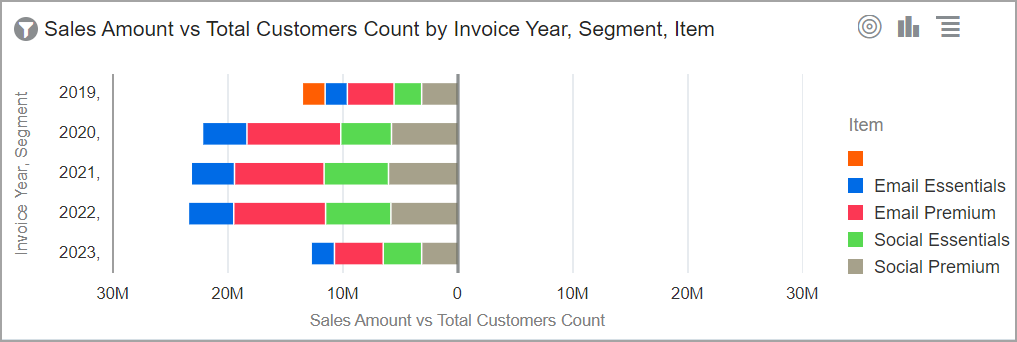 Ampliación del gráfico de barras horizontales de los valores numéricos de una categoría a dos o más. |