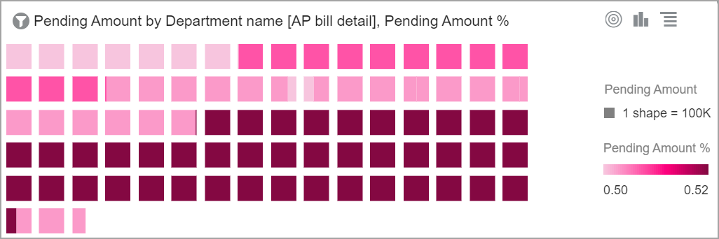 El gráfico de pictos permite visualizar las diferencias de valores con imágenes o símbolos. Los gráficos de picto suelen utilizar una métrica y un atributo con un número reducido de valores. La leyenda del gráfico muestra cómo se corresponden los colores con los valores. |