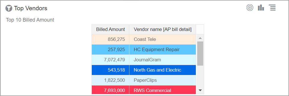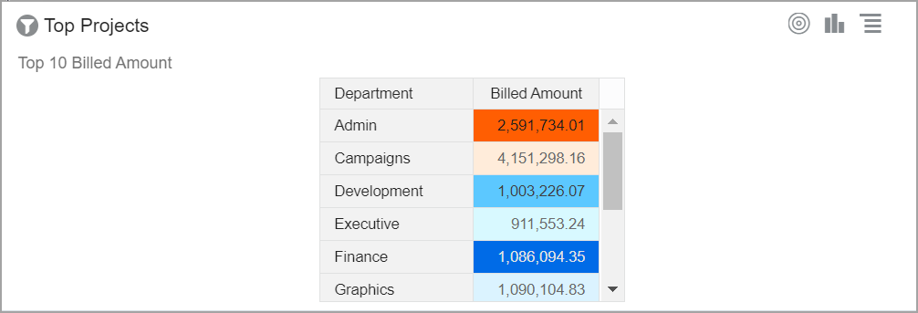 El gráfico de tabla organiza la información y los datos en un formato tabular desplazable. Puede organizar los datos de manera significativa para un análisis eficaz basado en datos. |
