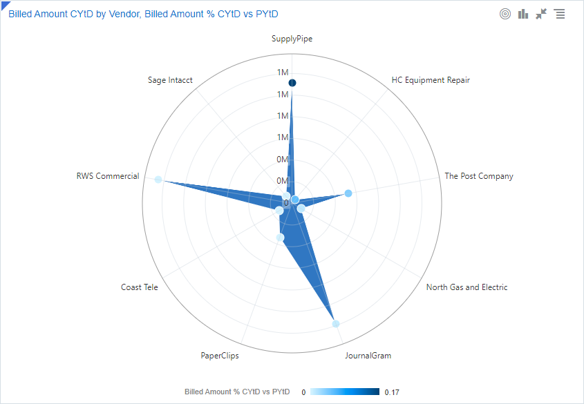 El gráfico de líneas de radar muestra varios puntos de datos y las variaciones entre ellos. Este gráfico es útil para comparar los puntos de dos o más conjuntos de datos. Puedes trazar varias variables en un solo gráfico para identificar patrones y tendencias en tu fecha. |