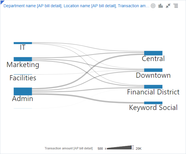 Los diagramas de Sankey representan un flujo de un conjunto de valores a otro, con el ancho de las flechas proporcional al caudal. Este tipo de gráfico es útil para visualizar el flujo de dinero en los presupuestos, los flujos de materiales o energía y los desgloses de costes. |